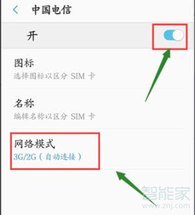 7、我们单击两张卡还可以分别进行开关设置,也可以对数据网络连接模式进行设置,如下图所示
