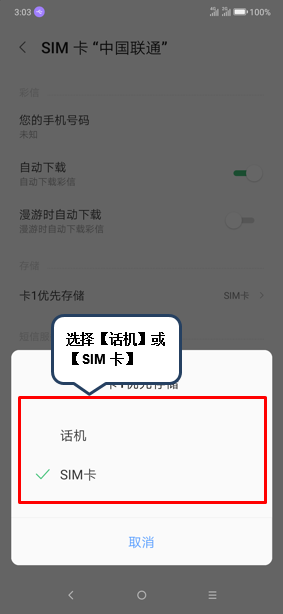 5、选择短信存储位置,可选择【话机】或【SIM卡】。