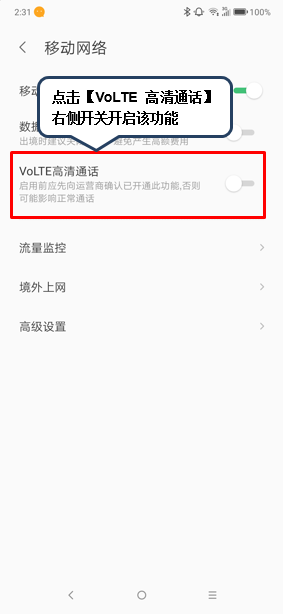 3、点击【VoLTE高清通话】右侧开关开启该功能,即可实现在运营商网络支持时,启用4G高清通话。
