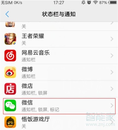 3、进入状态栏与通知以后,找到要设置的应用,这里以微信微信为例,点击进入。