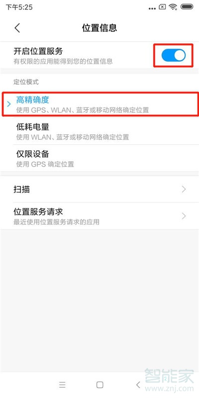 4、找到【开启位置服务】选项之后,点击开启即可,同时选择【高精确度】。