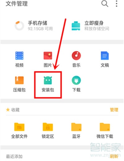 2、在文件管理菜单的文件分类中找到【安装包】选项,点击进入。