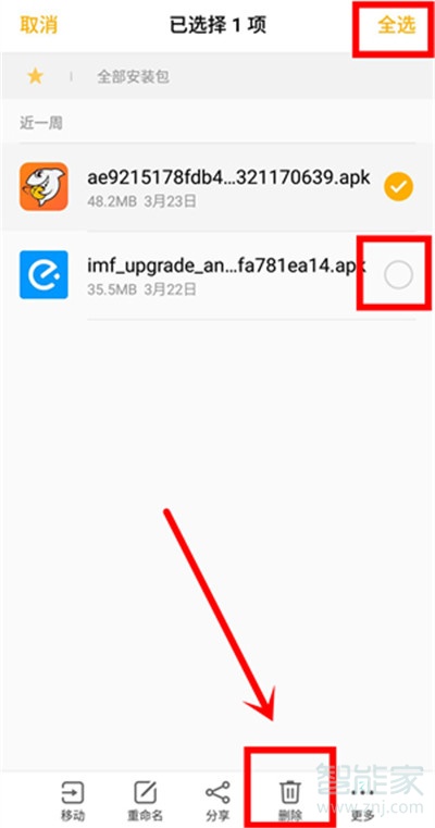 4、点击长按安装包,就会弹出操作控制栏,点选右侧的圆圈,或者顶部右上角的全选,可以选择需要删除的安装包,然后点击下方的删除即可。