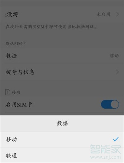 4、在底部选项中选择你想使用的流量数据卡,设置完成后可以在手机右上角看到你当前正在使用的流量卡1或卡2。