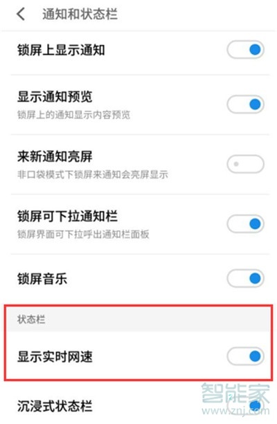 3、在状态栏一栏,打开【显示实时网速】后面的开关,即可显示实时网速。