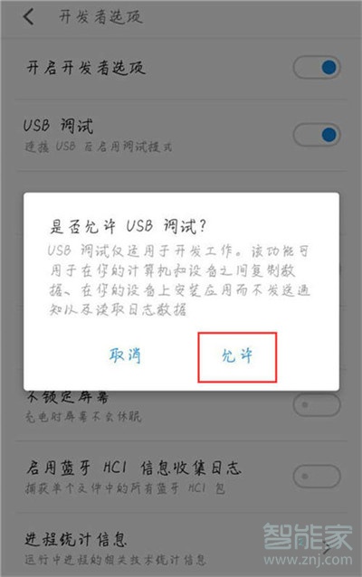 4、然后把开发者选项打开,找到【usb调试】点击打开,在弹出来的对话框点击允许即可。