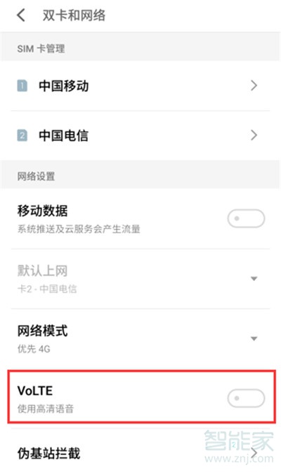 3、进入双卡和网络之后,选择打开【VoLTE】即可