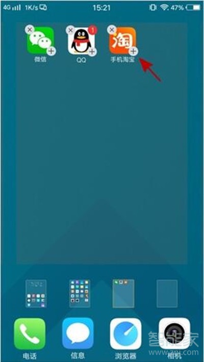 四、然后返回手机桌面,长按需要分身的应用图标,点击图标下方出现的加号,这里以手机淘宝为例
