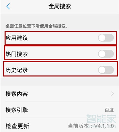 3.这时您可以自由选择打开或关闭“应用建议”、“热门搜索”和“历史记录”这三个选项,这三种都是根据智能算法提供的推荐,具体代表着什么意思您可以自己去尝试下。