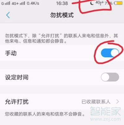 2、进入勿扰模式设置页面后,我们手动打开按钮,这时候,手机顶端就会出现一个月亮的形状,这个就表示勿扰模式的开启
