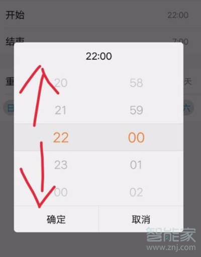 4、在开始时间和结束时间内,进行滑动时间轮盘,每个人时间安排不同,自行设置