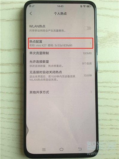 2、点击【WLAN热点】右侧的按钮开启,还可点击【热点配置】设置热点名称以及密码。