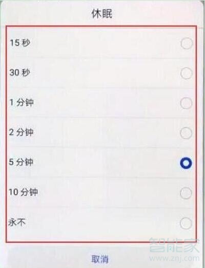 4、然后我们就可以在弹出的选项框中点击勾选合适的休眠熄屏时间,点击勾选【永不】的话,手机打开锁屏后即使无操作也会屏幕常亮。