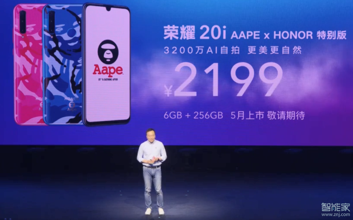 此外,荣耀还宣布与潮牌Aape合作,推出特别版荣耀20i手机,该机融入了Aape的迷彩元素,有丛林粉和幻野蓝两种配色。不过特别版要五月份才上市,想要购买特别版还得继续等一阵子。