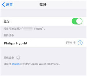 3.此时iPhone的蓝牙设备搜索列表上会出现飞利浦shb4205bk耳机的名字,如果没有,请尝试刷新蓝牙功能界面。选择“Philips Hyprlit”按照iPhone上显示的说明步骤配对连接。