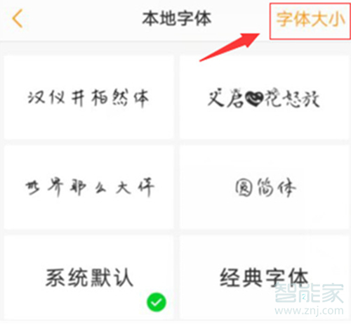 3、本地字体界面右上角有一个【字体大小】,点击进入。