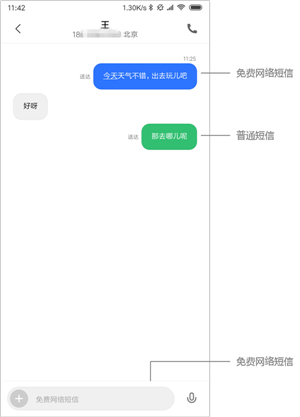 2.蓝色底色表示发送的短信是免费网络短信,绿色底色表示发送的短信是普通短信。