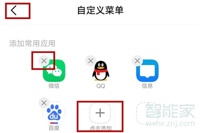 3、然后您可以在菜单中点击应用左上角“×”删除该应用,或者按住应用左右移动,变幻排列顺序。还可以点击“+”号添加其他应用。快捷工具菜单的操作也是如此。然后点击左上角【<】返回。