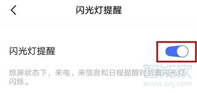 4、将闪光灯提醒按钮拨动到右侧,开启后,手机在熄屏状态下接收来电、信息和日程提醒时后置闪光灯都会闪烁。(摄像头下面的白圈)