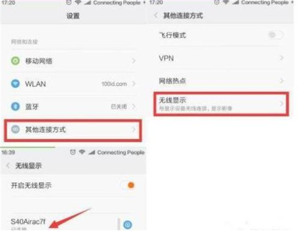 手机端点击“设置”中的“其他连接方式”,选择“无线显示”。
