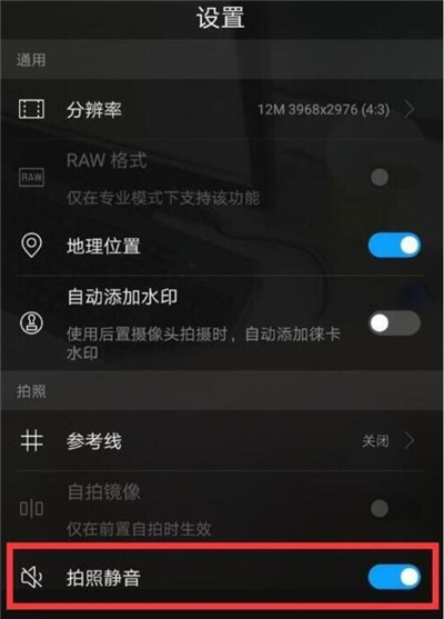 3、最后找到【拍照静音】,点击打开这个开关即可关闭拍照声音,如下为打开,关闭这个开关即可打开快门声音。