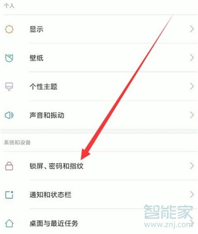 2.在设置界面,找到【锁屏、密码和指纹】点击进入此选项。