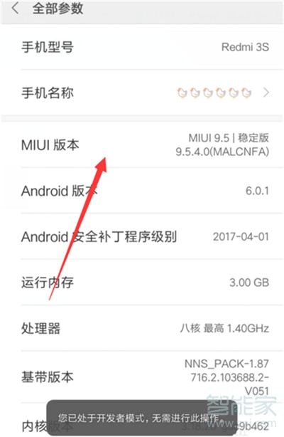 然后多次连续点击MIUI版本这个位置,点击6次后下方就会出现开发者选项的提醒