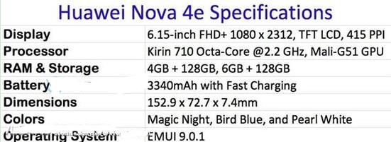 华为nova4e是什么处理器3月8日消息,知名爆料人士Slashleaks放出了华为nova 4e的详细规格。华为nova 4e搭载麒麟710处理器(这是继华为nova 3i之后第二款搭载麒麟710芯片的华为nova系列手机),采用了6.15英寸水滴屏,分辨率为2312×1080。LCD材质、415PPI,提供4GB+128GB和6GB+128GB两种选择,电池容量为3340mAh,运行基于Android深度定制的EMUI 9.0系统。