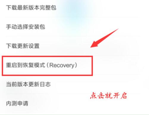第五步:之后我们可以看到下载最新版本安装包、手动选择安装包、下载更新设置和重启到恢复模式等6个选项,我们点击【重启到恢复模式】即可。