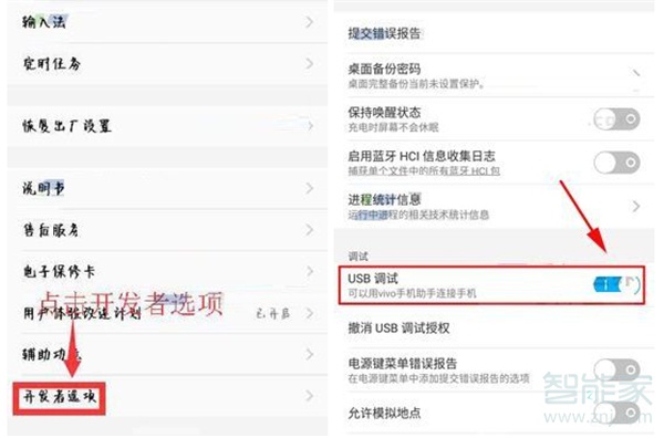 3.随后再滑动屏幕找到【开发者选项】点击进去,找到“调试”选项栏,打开【USB调试】选项右侧滑动条,使其为蓝色;然后插上数据线连接电脑即可连接。