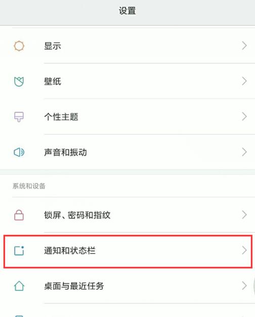 第二步:在设置界面下拉,找到【通知和状态栏】点击打开,