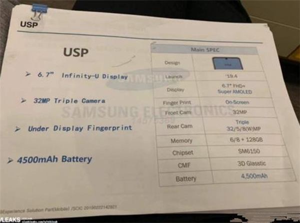此外,据爆料消息称,三星A60内置4500mAh超大电池,采用了6/8GB+128GB的内存组合方案。屏幕方面,三星A60采用了6.7英寸FHD+水滴屏设计,同时也采用了屏幕指纹解锁。