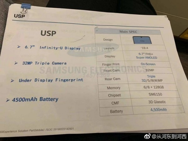 其他方面,从图中可以看到,三星A60搭载了高通骁龙675移动平台, 内置4500mAh超大电池,采用了6/8GB+128GB的内存组合方案,应该会继续支持MicroSD卡扩展。相机方面,三星A60采用了3200万像素前置摄像头,后置则是和A50一样采用三摄方案,其中主摄像头从2500万升级至3200万像素。