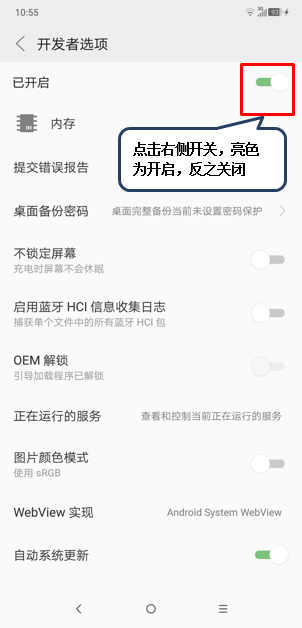 5、返回【系统】界面,点击【开发者选项】,点击右上角开关开启开发者选项,点击【USB调试】右侧开关亮色为开启状态,反之为关闭。