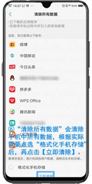 6、“清除所有数据”会清除手机中所有数据,根据实际需要点选“格式化手机储存”后,在点击【立即清除】。