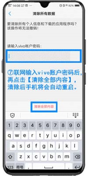 7、联网输入vivo账户密码之后,在点击【清除全部内容】,清除后手机将会自动启动。