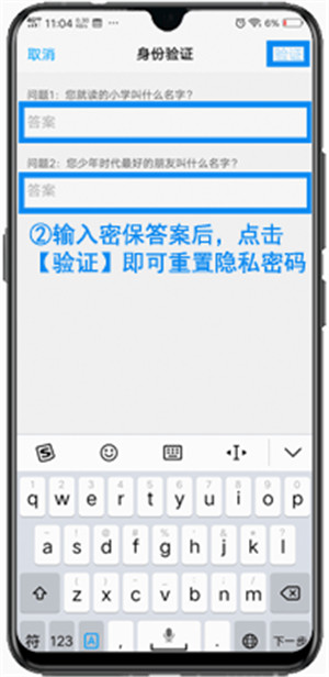 2.在身份验证的界面输入密保问题的答案,点击验证即可重置隐私密码。