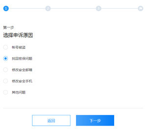 4.在选择申诉原因的对话框中选择找回密保问题,点击下一步。
