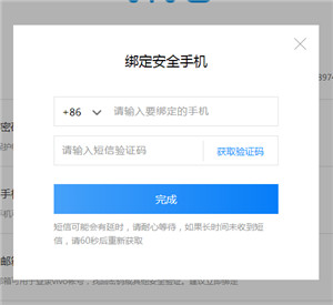 4、在弹出绑定安全手机对话框中填入需要绑定的新号码,点击获取验证码,等待新号码上获取到验证码之后,填入对话框并点击完成即可完成绑定新的安全手机号。