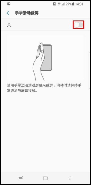 4、点击右侧滑块开关,显示“开”代表已开启。开启后,当您想要截屏时,将您的手掌从屏幕一边向另一边滑动,滑动时手掌侧面保持与屏幕接触即可截屏。