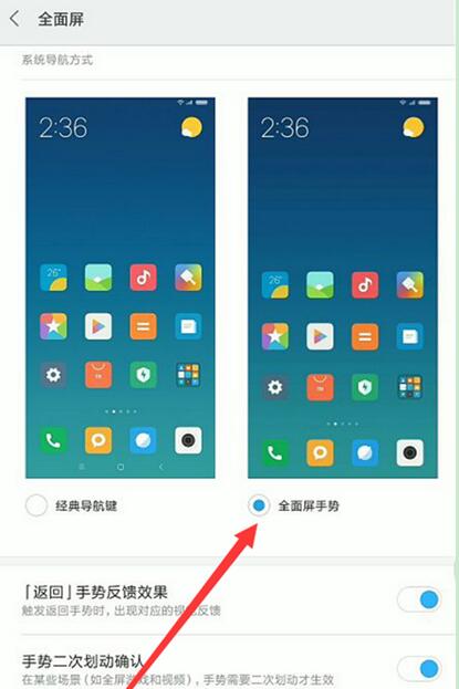 第三步:在全面屏界面点击选择【经典导航键】,就可以打开虚拟导航键了;选择【全面屏手势】,就可以关闭隐藏虚拟导航键了。