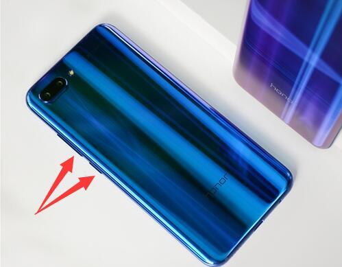 方法一、快捷键截屏。最快捷的截屏方式!同时按下荣耀机身右侧的的电源键和音量下键即可,如下图所示。