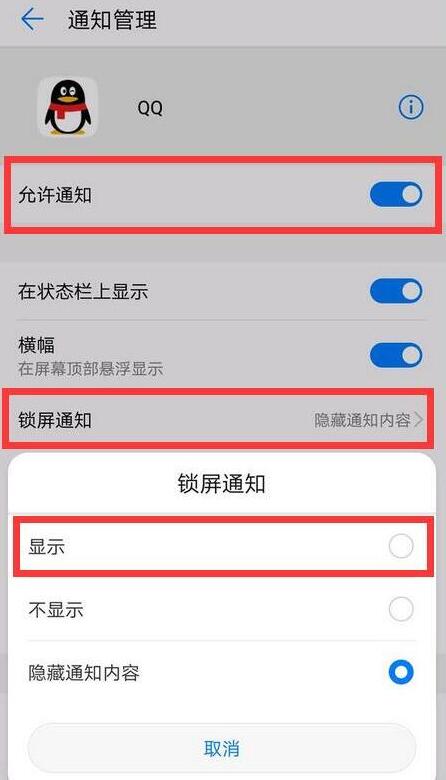 10、点击打开【允许通知】开关,再点击【锁屏通知】,选择勾选【显示】即可。