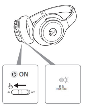 将耳机与Windows10系统电脑连接1.将铁三角sr30bt耳机的电源开关拨向 “on” 档位,使耳机开机并进入配对模式,指示快速灯闪烁白色灯光。