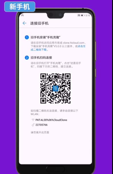 3、在旧手机上,点开️【手机克隆】->️【这是旧手机】,会出来扫描二维码的页面,用旧手机扫描二维码,按照指导,手机连接成功。