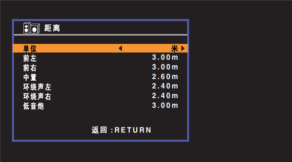 ②使用光标键(上/下)来选择音箱,并用光标键(左/右)来设定距离。
