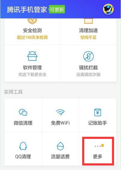 2、进入如下图所示的腾讯手管家页面后,然后向上拉动页面。找到实用工具栏目,点击栏目中的【更多】字体。