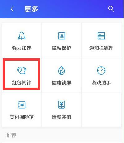 3、出现“更多”栏目,在栏目中有“红包闹钟”字样,点击红包闹钟进入下一步。