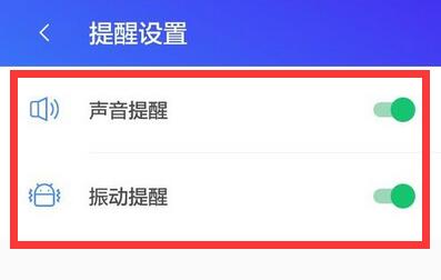 5、点击上图中右上角的设置图形按钮。进入下一步。如下图示就是已经设置好的提醒方式的界面。提醒方式有2种:声音提醒、振动提醒。可以全选和单选。只要拉动右侧对应的开关变成绿色即可完成设置。