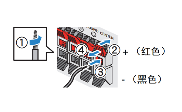 ①从音箱缆线端部剥去大约10mm的绝缘皮,然后将缆线的裸线紧紧捻在一起。